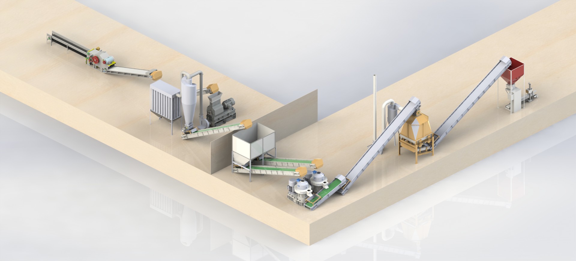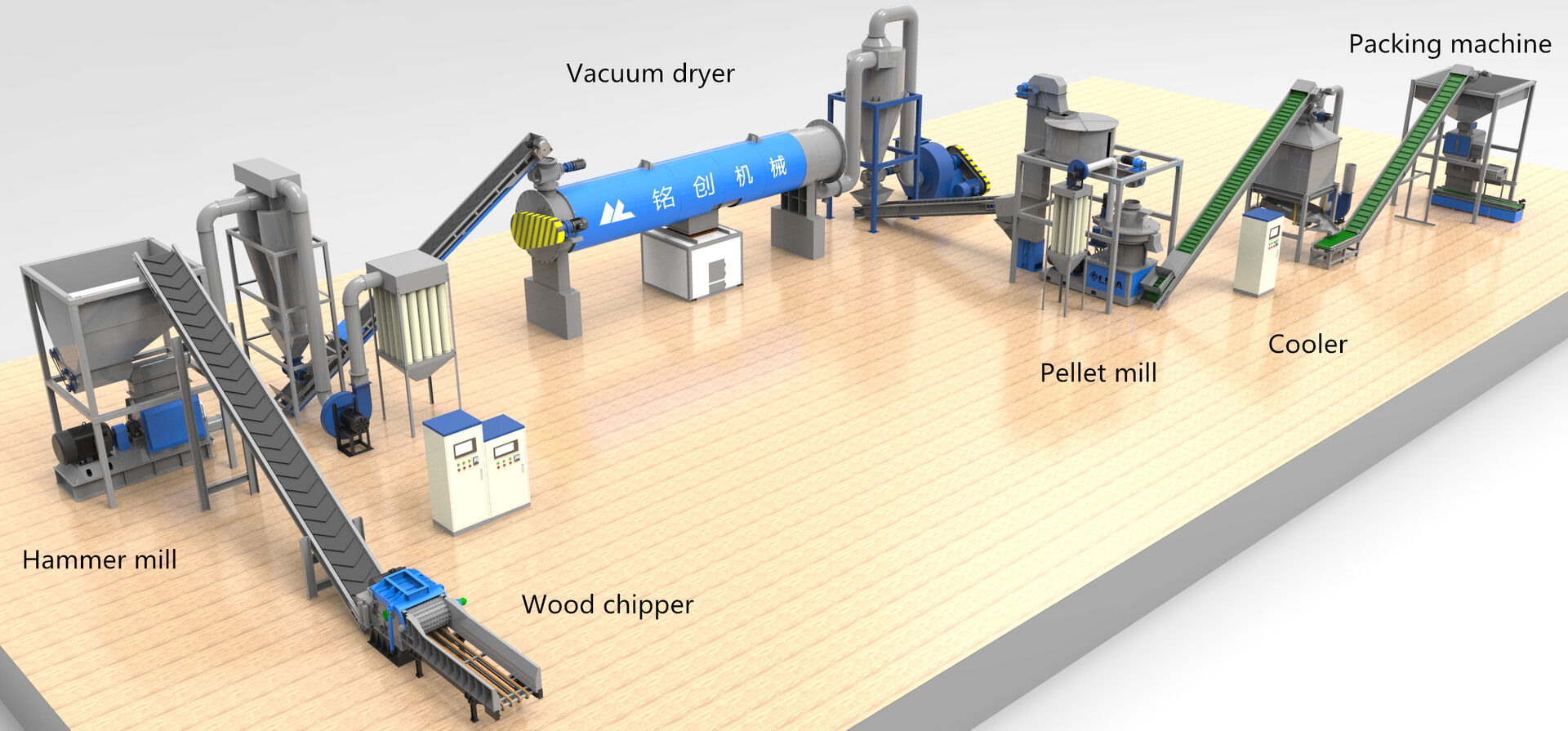 木材生产线,主要包括6大工段:破碎工段/粉碎工段/烘干工段/制粒工段/冷却工段/包装工段