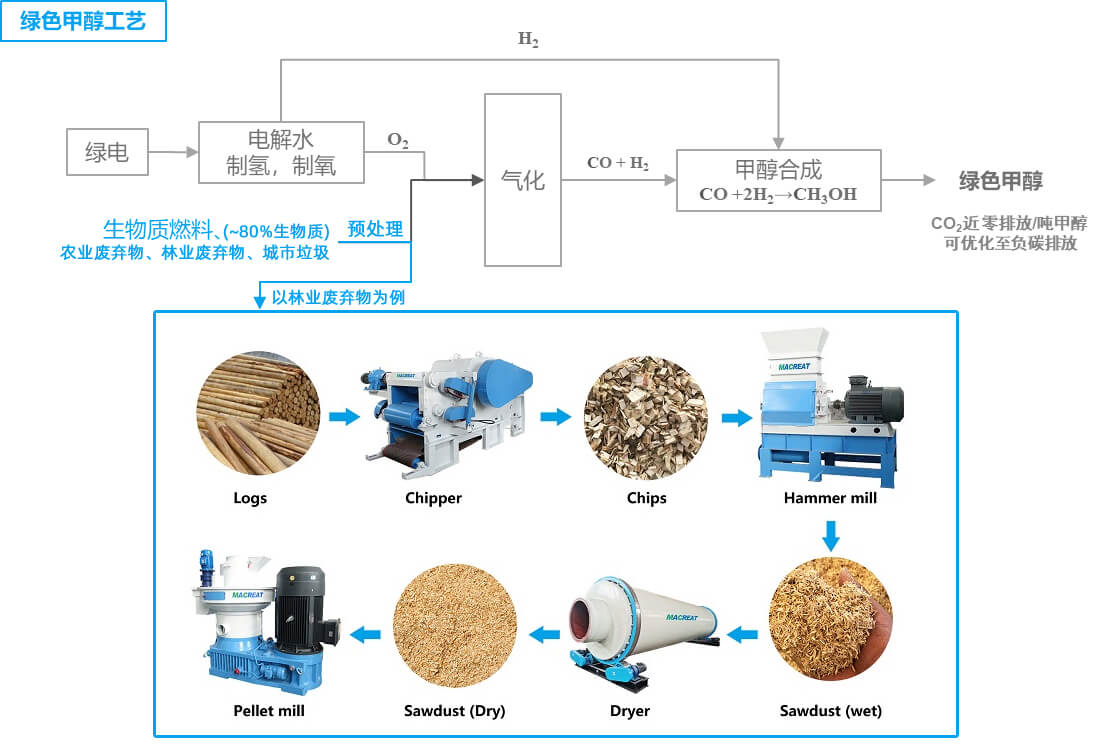 预处理:将收集到的生物质原材料需要先进行清洗和筛选,以保证甲醇的纯度,然后做破碎、粉碎、烘干、制粒等预处理操作,使其满足后续加工的要求。